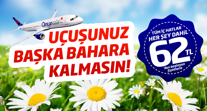 Biletinizi en az bir hafta önceden alın, Mart ve Nisan aylarında Onur Air ile tüm iç hatlarda her şey dahil sadece 62 TL'den (Bu fiyat sadece Onur Air'in web sitesi www.onurair.com 'dan, Onur Air'in mobil sitesinden, Onur Air'in iOS ya da Android mobil uygulamalarından bilet satın alırken geçerlidir) başlayan fiyatlarla uçun!