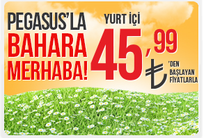Pegasus bahara indirimle merhaba diyor! 5 Mayıs - 10 Haziran 2014 tarihleri arasında yurt içinde 45,99TL'den başlayan fiyatlarla doya doya uçmanın keyfine varın. Haydi acele edin, bu fırsatı kaçırmayın!