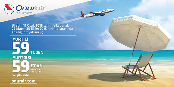 Onur Air ile biletini 7-17 Ocak tarihine kadar al, 29 Mart - 25 Ekim 2015 tarihleri arasında vergiler dahil yurtiçi 59 Lira’dan, yurtdışı 59 Euro’dan başlayan fiyatlara uç.